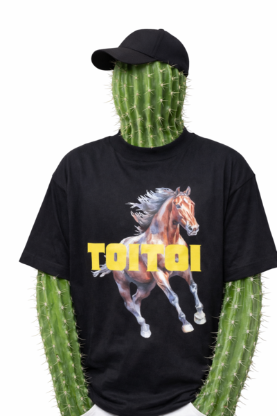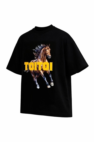 Streetwear style box cut tee with hand painted horse + logo print. A3 print, custom toitoi logo. Thick cotton, 220gsm, longer lasting, almost sweater like thickness quality tee. Semi polar tight crew neck. Box cut, oversized comfort fit/look. Available in M-XXXL